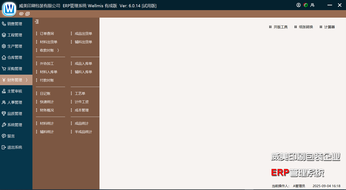 ● 子模块包括:订单查询,成品入库单、成品出货单、材料入库单、材料出货单,外协加工单、日记账、工艺单查询、计件工资、成本管理、材料统计等。